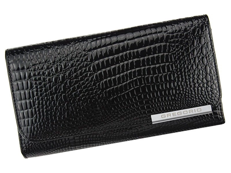 - Duży, klasyczny, podłużny damski portfel od marki Gregorio. Wykonany z wysokogatunkowej skóry naturalnej. Wykończony srebrnymi zdobieniami. Piękna lakierowana faktura ze wzorem skóry krokodyla. Wewnątrz bogato wyposażony.
