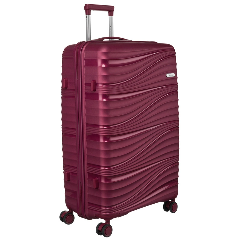 • Średniej wielkości walizka w kolorze burgundowym, z lekkim, trwałym korpusem. Wyposażona w 4 podwójne kółka, teleskopową rączkę i wbudowany zamek TSA. Wnętrze z elastycznymi pasami do organizacji bagażu.