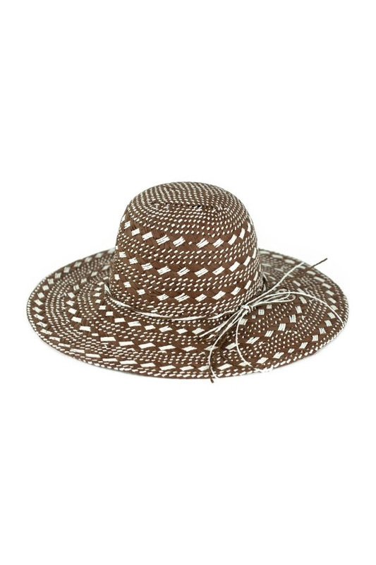 Piękny letni kapelusz z szerokim rondem, ozdobiony motywem przeplatanki i kokardką z rafii.