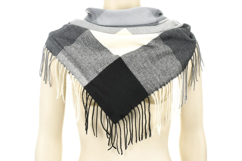 Modny, duży, przyjemny w dotyku szalik damski z oryginalnym wzorem w kratę i frędzlami