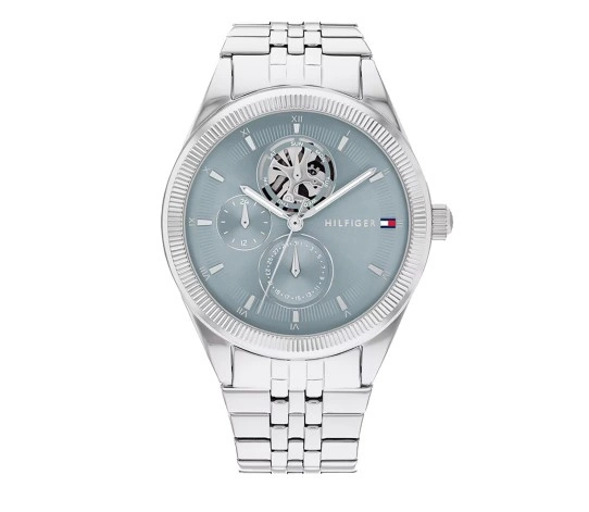 Zegarek Tommy Hilfiger 1782714 Monica to elegancki damski czasomierz zasilany niezawodnym kwarcowym mechanizmem. Koperta oraz bransoleta zostały wykonana ze stali szlachetnej w kolorze srebrnym, co gwarantuje jej wieloletnią odporność na zniszczenie. Całość uzupełnia elegancka niebieska tarcza typu open-heart, chroniona szkłem mineralnym. Dodatkowo na tarczy znajduje się datownik oraz czas 24-godzinny.