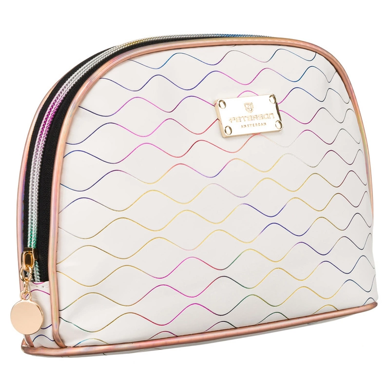 Modna kosmetyczka z białego materiału ozdobionego delikatnym, falistym wzorem w wielokolorowej tonacji. Lamówka w odcieniu różu z efektem holograficznym mieniącym się wieloma barwami. Kolorowy, metaliczny suwak i okrągła zawieszka ozdobna w złotym kolorze nadają produktowi wyjątkowy charakter.