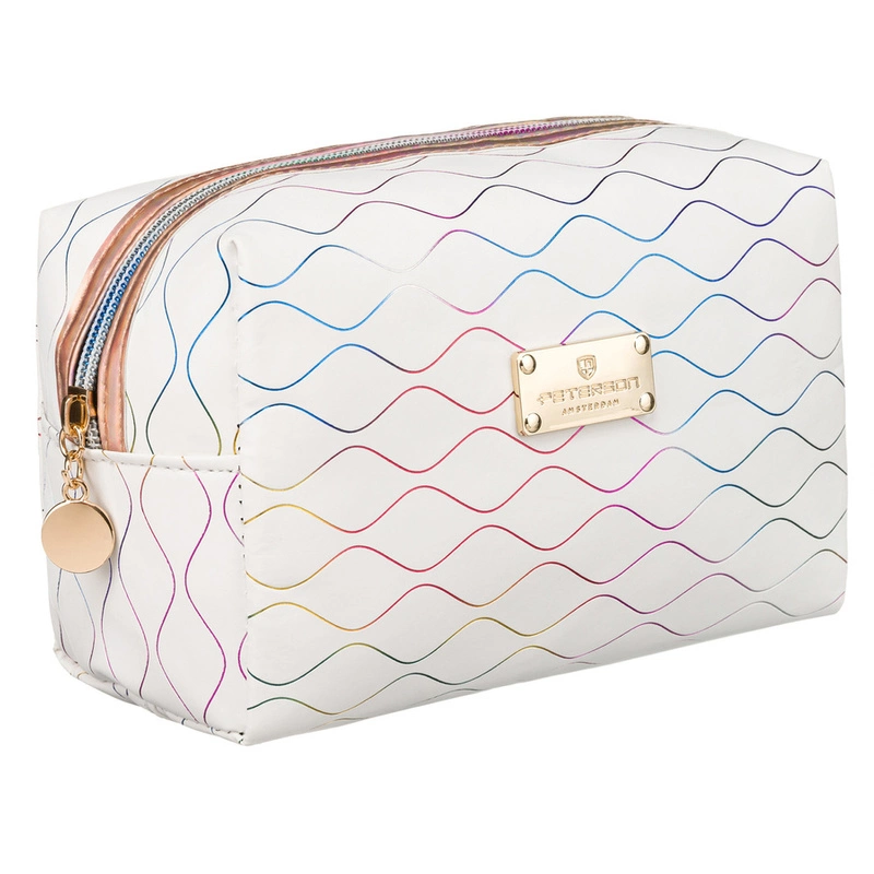 Modna kosmetyczka z białego materiału ozdobionego delikatnym, falistym wzorem w wielokolorowej tonacji. Wykończenie w odcieniu różu z efektem holograficznym mieniącym się wieloma barwami. Kolorowy, metaliczny suwak i okrągła zawieszka ozdobna w złotym kolorze nadają produktowi wyjątkowy charakter.