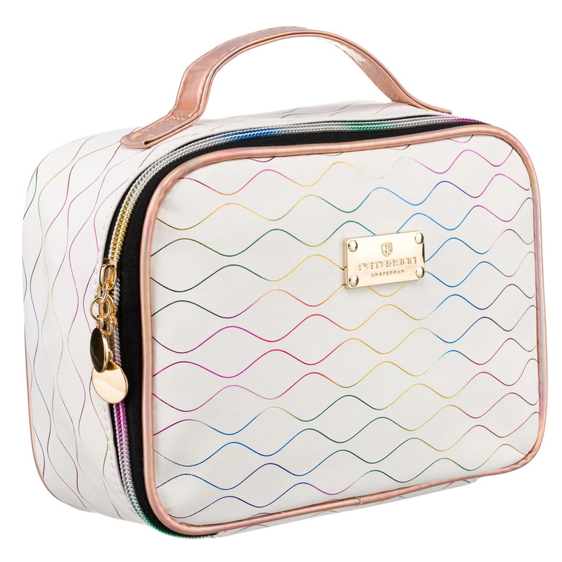 Stylowa kosmetyczka z białego materiału ozdobionego delikatnym, falistym wzorem w wielokolorowej tonacji. Uchwyt i lamówka w odcieniu różu z efektem holograficznym mieniącym się wieloma barwami. Kolorowy metaliczny suwak i okrągłe zawieszki ozdobne w złotym kolorze nadają produktowi wyjątkowy charakter.