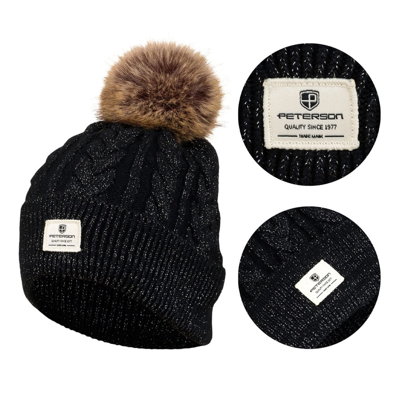 - Stylowa damska czapka Peterson w kolorze czarnym, wykonana z miękkiej dzianiny akrylowej. Charakteryzuje się warkoczowym splotem, wywiniętym ściągaczem oraz puszystym pomponem. Rozmiar uniwersalny zapewnia komfort noszenia w chłodne dni.
