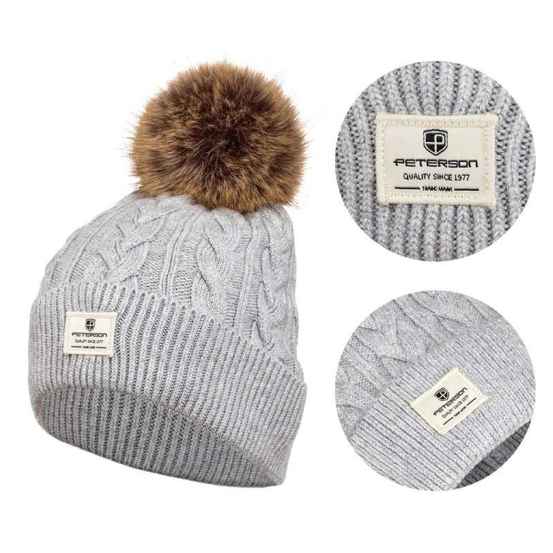 - Elegancka szara czapka damska Peterson, wykonana z miękkiego akrylu, idealna na zimę i jesień. Ozdobiona stylowym warkoczowym splotem i puszystym pomponem. Wywijany ściągacz zapewnia wygodę i idealne dopasowanie.