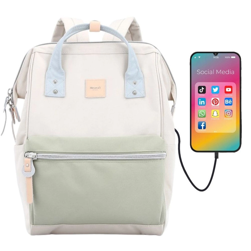 - Stylowy plecak Himawari w odcieniu beżowo-zielonym. Pojemność idealna na dokumenty A4 i laptopa. Wyposażony w port USB, boczne kieszenie i wewnętrzną przegrodę. Wygodny i lekki, doskonały do szkoły, pracy i na miasto.