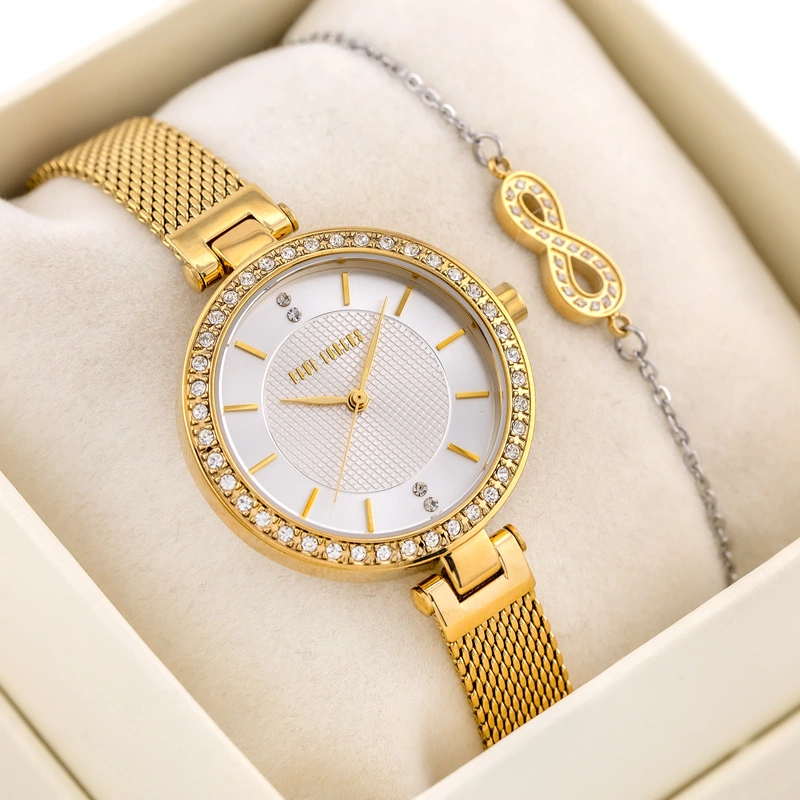 Komplet prezentowy damski, który zachwyca swoją elegancją i ponadczasowym stylem. Zawiera zegarek ze stali szlachetnej marki Paul Lorens w kolorze złotym, z piękną tarczą w kolorze srebrnym, która subtelnie podkreśla jego klasyczny charakter. Złota koperta zegarka zdobiona kryształkami, dodaje całości wyjątkowego blasku. Zegarek charakteryzuje się także wodoszczelnością WR30, co sprawia, że jest praktyczny i funkcjonalny. Do kompletu dołączona jest elegancka bransoletka w kolorze srebrnym ze złotym znakiem nieskończoności, która perfekcyjnie komponuje się z zegarkiem. To idealny wybór na prezent – elegancki, piękny i niezapomniany.