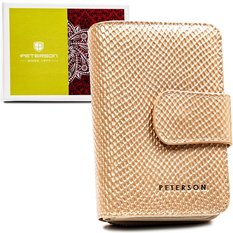 - Elegancki portfel damski w modnym, złotym kolorze. Zamykany mocnym zatrzaskiem. Akcesorium wykonane ze skóry naturalnej zdobionej wężowym wzorem. Wewnątrz wygodne zakładki na karty i miejsce na dowód rejestracyjny. Portfel z podwójną sekcją na bilon.