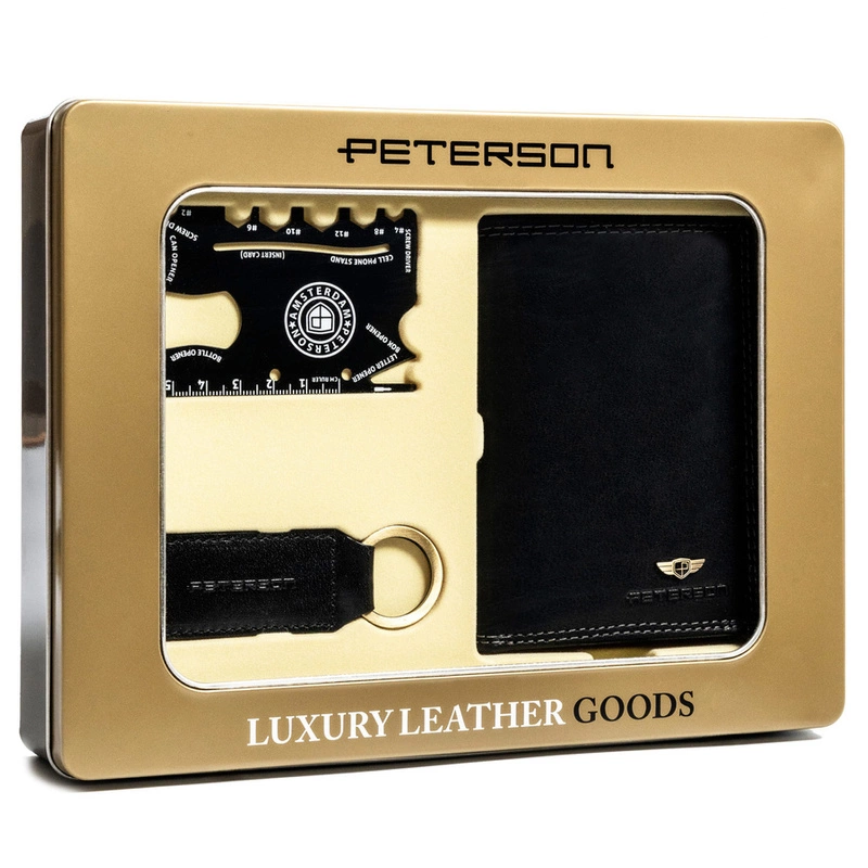 - Zestaw prezentowy Peterson to idealny wybór dla mężczyzn ceniących styl i funkcjonalność. W skład wchodzi portfel ze skóry naturalnej z 8 miejscami na karty i ochroną RFID, elegancki brelok oraz karta survivalowa. Całość zapakowana w luksusowe pudełko.