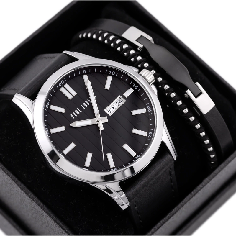 Komplet prezentowy męski, który łączy elegancję z ponadczasowym stylem. Zawiera zegarek marki Paul Lorens, na czarnym pasku, z klasyczną, czarną tarczą ozdobioną srebrnym indeksem, co nadaje mu subtelną i wyrafinowaną estetykę. Srebrna koperta zegarka doskonale komponuje się z całością, tworząc wyjątkowy design. Zegarek charakteryzuje się wodoszczelnością WR30, co zapewnia jego funkcjonalność i trwałość. Komplet zawiera również skórzaną, czarna bransoletę ze srebrnymi elementami, która stanowi doskonałe uzupełnienie całości. To idealny wybór na święta – elegancki, męski i wyjątkowy prezent, który zachwyci każdego.