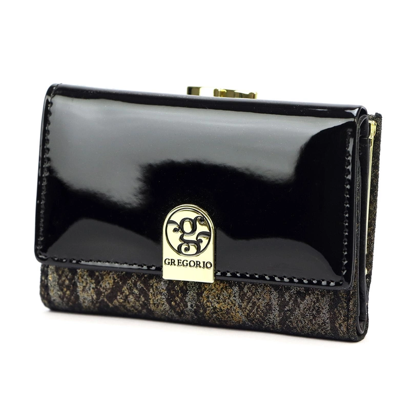 Portfel Gregorio to elegancka propozycja dla kobiet, które cenią zarówno funkcjonalność, jak i stylowy wygląd. Wykonany z wysokiej jakości skóry naturalnej, wyróżnia się poziomą orientacją, co zapewnia wygodne użytkowanie. Złote okucia nadają mu subtelnej elegancji, a element ze skóry węża, umiejscowiony na przodzie, dodaje całości wyjątkowego charakteru, przyciągając wzrok i dodając odrobinę luksusu.