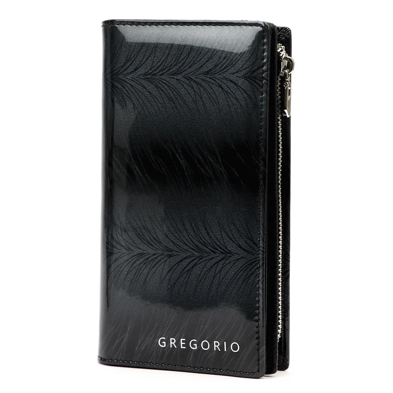 Portfel marki Gregorio to kwintesencja stylu i funkcjonalności. Wykonany z wysokiej jakości lakierowanej skóry naturalnej, zdobionej subtelnym wzorem pióra, jest idealnym dodatkiem dla kobiet ceniących luksusowy design i wygodę.