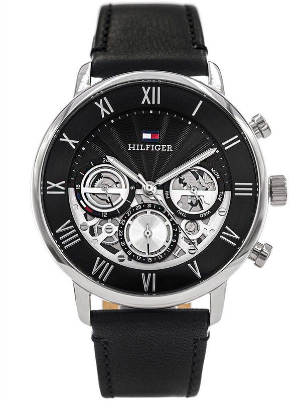 Zegarek męski TOMMY HILFIGER 1710565 Legend to nowoczesny i elegancki model do noszenia na co dzień, jak i na specjalne okazje. Koperta wykonana z wysokiej klasy stali szlachetnej 316L, odpornej na korozję oraz hipoalergicznej w kolorze srebrnym. Na eleganckiej czarnej tarczy, ze szlifem słonecznym znajdują się subtarcze wskazujące: dzień miesiąca, dzień tygodnia oraz czas 24 godzinny. Elegancji dodaję czarny skórzany pasek. Całość chroniona szkłem mineralnym. Za odmierzanie czasu w zegarku Tommy Hilfiger 1710565 Legend odpowiada mechanizm kwarcowy, który można podglądać przez tarczę typu open-heart. Model 1710565 Legend posiada wodoszczelność na poziomie 5ATM co czyni go w niewielkim stopniu odpornym za wodę. Całość dopracowano w najdrobniejszym szczególe oraz zaprojektowano w zgodzie z aktualnymi trendami w modzie, otrzymując klasyczny, ale jakże elegancki zegarek.