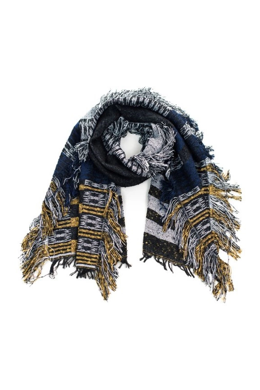 Ciepły szal w melanżach. Wykończony frędzlami.