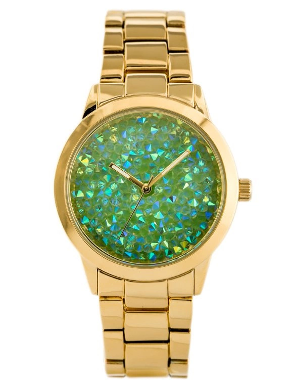 Kolorystyka: tarcza pokryta cyrkoniami w kolorach zielonym i turkusowym, bransoleta w kolorze złotym, koperta w kolorze złotym