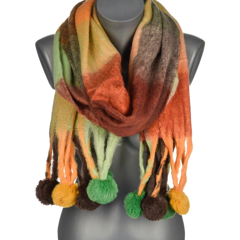 Brązowy Jesienny duży Szalik Damski ciepły szal w kratę frędzle pompon szal-84