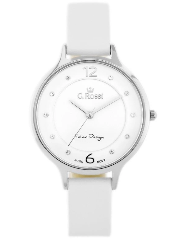 Zegarek damski G. ROSSI 10411A-3C1 to elegancka propozycja na co dzień, która łączy subtelną kobiecość z wyjątkowym stylem. Z białym paskiem ze skóry, kopertą w srebrnym odcieniu i białą tarczą, prezentuje się bardzo szykownie. Indeksy na tarczy to delikatne kryształki, które dodają mu blasku i finezji. Zegarek posiada wodoodporność na poziomie WR30, co zapewnia komfort użytkowania w codziennych sytuacjach. Idealny wybór dla kobiet ceniących elegancję, ale szukających także praktyczności w swoich dodatkach.
