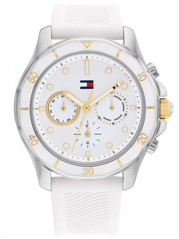 Zegarek Tommy Hilfiger Brooklyn 1782568 to wyjątkowa propozycja od kultowej już marki, będąca odzwierciedleniem najgorętszych trendów. Ten elegancki damski czasomierz zasilany niezawodnym kwarcowym mechanizmem. Koperta została wykonana ze stali szlachetnej, co gwarantuje jej wieloletnią odporność na zniszczenie. Pasek zegarka wykonany został z tworzywa/gumowy, który zapewnia wygodę podczas noszenia. Całość jest utrzymana w kolorze białym, dodatkowym atutem jest czytelna biała tarcza ze złotym indeksem ozdobiona szlifem słonecznym, który nadaje nowoczesnego industrialnego charakteru. Ponadto model ten jest nie tylko ładny ale i funkcjonalny, posiada trzy subtarcze: dni tygodnia, dni miesiąca oraz czas 24H. Wodoszczelność rzędu 5 ATM, gwarantuje ochronę nawet podczas kąpieli..