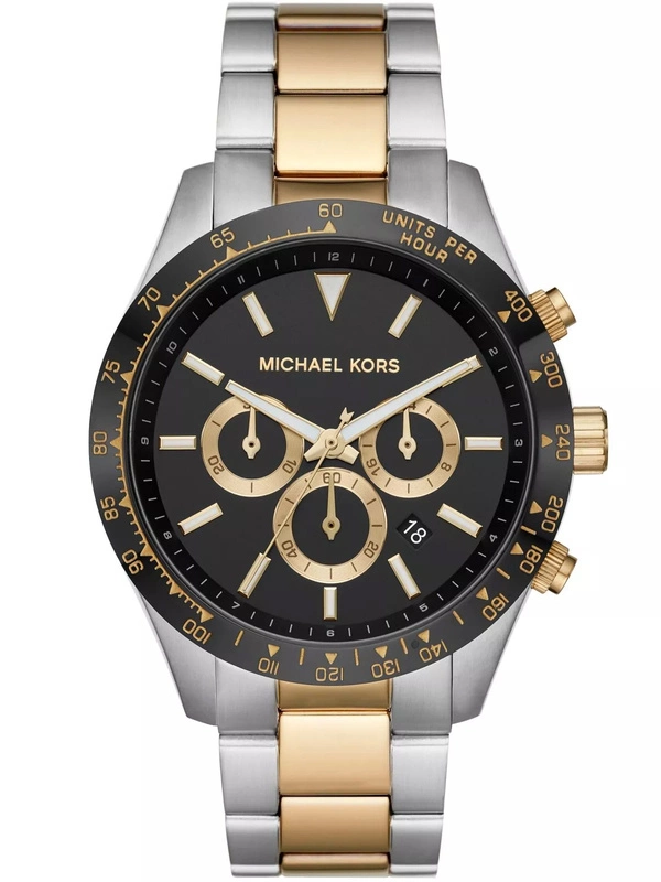 Model Michael Kors MK8784 to elegancki męski zegarek na bransolecie w kolorze srebrnym / złotym wykonanej ze stali szlachetnej. Wyposażony jest w precyzyjny mechanizm kwarcowy, dzięki któremu zegarek dokładanie pokazuje aktualną godzinę. Dostępne funkcje to chronograf, datownik dnia miesiąca oraz 24-godzinne wskazanie czasu. Tarczę ochrania mineralne, odporne na zarysowania szkiełko.