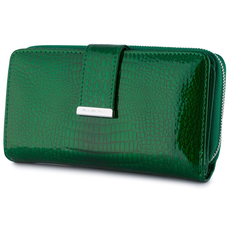 skórzany portfel damski lakierowany duży poziomy w piórka elegancki zielony Jennifer Jones E72