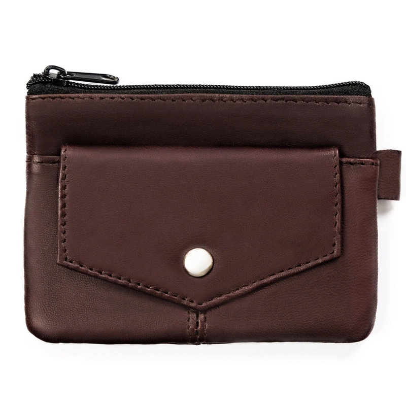 • Etui wykonane ze skóry naturalnej w brązowym kolorze. Wyposażone w kółeczko na klucze i kieszonki na suwak. Zamykane suwakiem i zatrzaskiem.