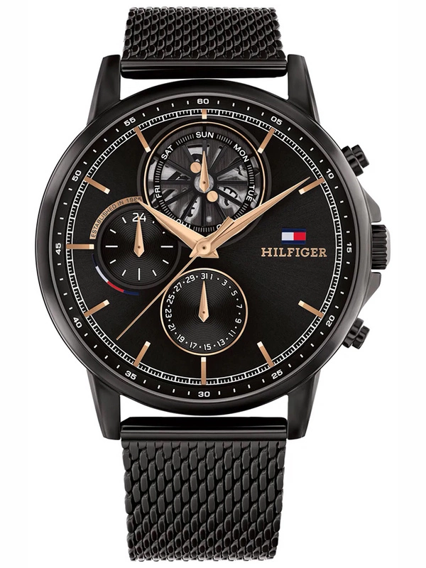 Zegarek męski TOMMY HILFIGER TYSON 1710610 to unikatowe połączenie czerni i różowego złota. Koperta i bransoleta wykonana z wysokiej klasy stali szlachetnej 316L w kolorze czarnym, odpornej na korozję oraz hipoalergicznej. Na czarnej tarczy, ze szlifem słonecznym, znajdują się subtarcze wskazujące: dzień miesiąca, dzień tygodnia oraz czas 24 godzinny. Całość chroniona szkłem mineralnym. Za odmierzanie czasu w zegarku Tommy Hilfiger 1710610 odpowiada mechanizm kwarcowy, do którego energia go zasilająca pochodzi z baterii. Model 1710610 posiada wodoszczelność na poziomie 5ATM co czyni go w niewielkim stopniu odpornym za wodę. Całość dopracowano w najdrobniejszym szczególe oraz zaprojektowano w zgodzie z aktualnymi trendami w modzie, otrzymując klasyczny, ale jakże elegancki zegarek.