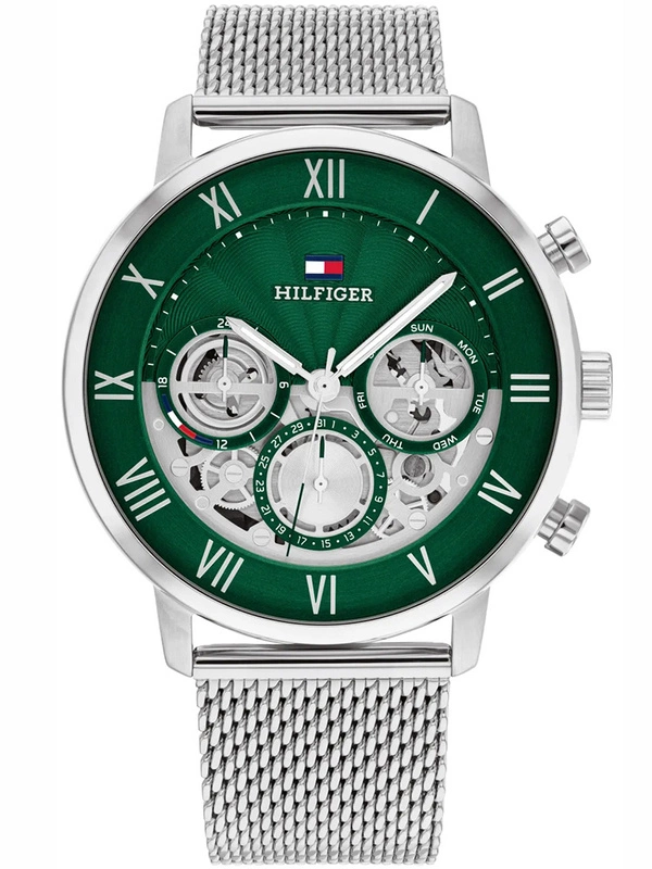Zegarek męski TOMMY HILFIGER 1710567 Legend to nowoczesny i elegancki model do noszenia na co dzień. Koperta oraz bransoleta wykonana wysokiej klasy stali szlachetnej 316L, odpornej na korozję oraz hipoalergicznej w kolorze srebrnym. Na oryginalnej zielonej tarczy , ze szlifem słonecznym znajdują się subtarcze wskazujące: dzień miesiąca, dzień tygodnia oraz czas 24 godzinny. Całość chroniona szkłem mineralnym. Za odmierzanie czasu w zegarku Tommy Hilfiger 1710567 Legend odpowiada mechanizm kwarcowy, który można podglądać przez tarczę typu open-heart. Model 1710567 Legend posiada wodoszczelność na poziomie 5ATM co czyni go w niewielkim stopniu odpornym za wodę. Całość dopracowano w najdrobniejszym szczególe oraz zaprojektowano w zgodzie z aktualnymi trendami w modzie, otrzymując klasyczny, ale jakże elegancki zegarek.