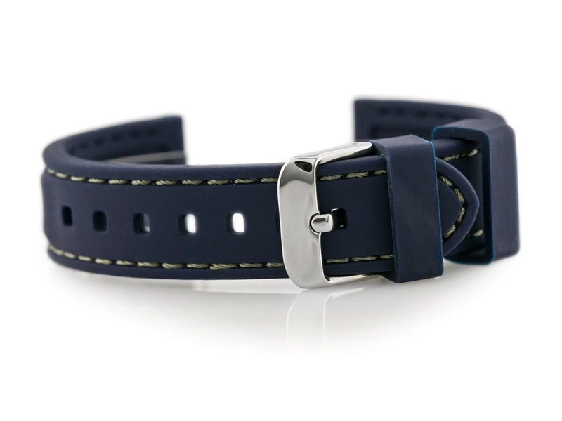 Gumowy pasek do zegarka wysokiej jakości w kolorze granatowym z przeszyciami w kolorze grafitowym.