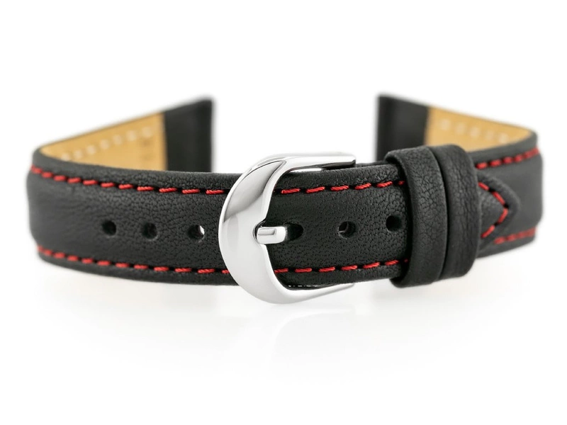 Pasek ze skóry naturalnej w kolorze czarnym z czerwonymi przeszyciami. Klamerka ze stali szlachetnej w kolorze srebrnym.