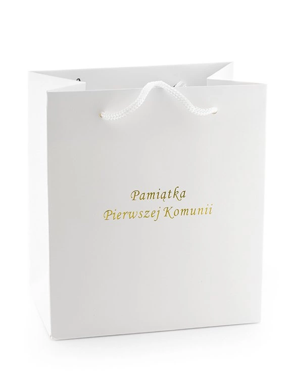 • Torebka prezentowa w kolorze białym ze złotym napisem "Pamiątka Pierwszej Komunii"