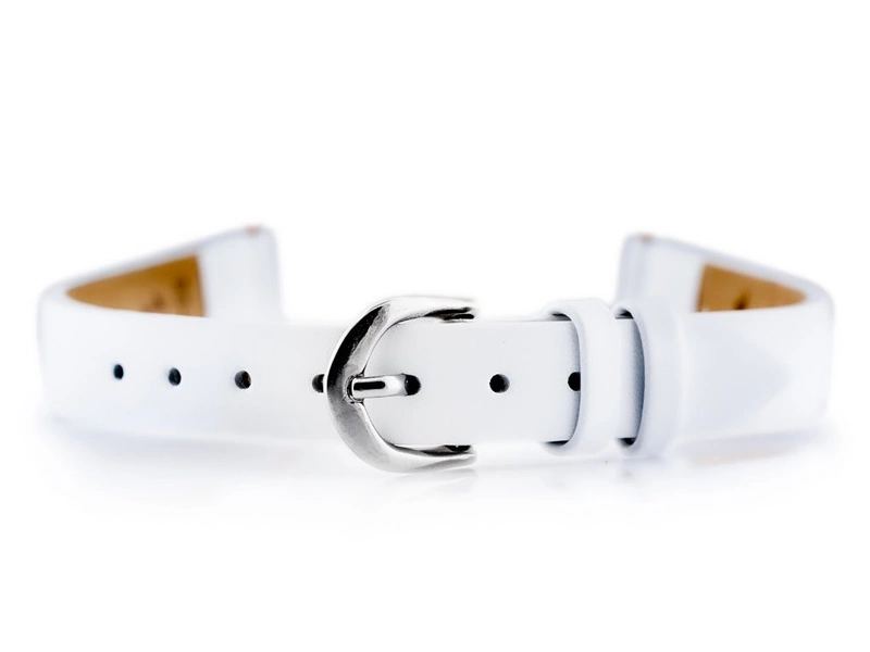 Pasek ze skóry naturalnej w kolorze białym. Klamerka ze stali szlachetnej w kolorze srebrnym.