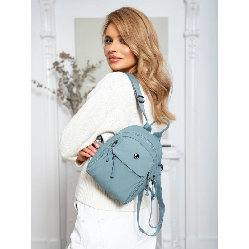 - Mały, miejski plecak damski wykonany z poliestru. Plecak w błękitnym kolorze zamykany suwakami. Okucia w srebrnym kolorze. Zawieszony na regulowanych szelkach, wyposażony w sześć dodatkowych kieszeni.