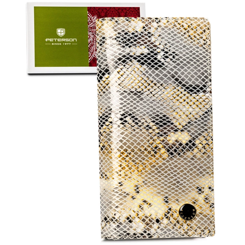 Skórzany portfel damski na magnes z fakturą imitującą skórę węża w beżowym kolorze - Peterson