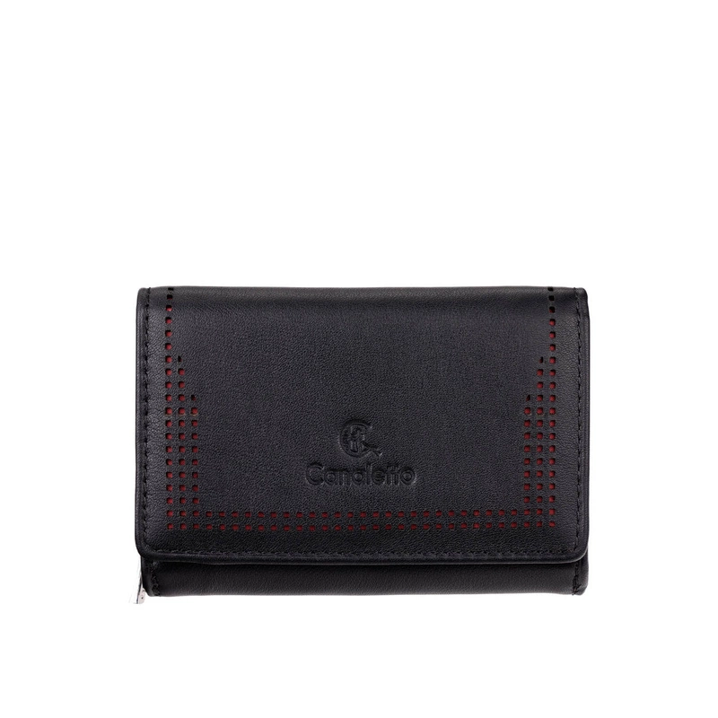 - Stylowy czarny portfel damski Canaletto z naturalnej skóry licowej z perforacją laserową. Posiada około 10 przegródek na karty, okienko na zdjęcie, kieszeń na monety oraz przegrodę na banknoty. Polski produkt najwyższej jakości.