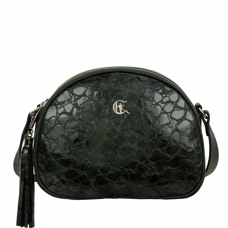 Torebka zachwyca głębokim, zielonym kolorem i eleganckim połyskiem skóry lakierowanej, które przyciągają wzrok i dodają jej wyrafinowanego charakteru. Subtelny ozdobny frędzel stanowi stylowy akcent, który dopełnia całość.