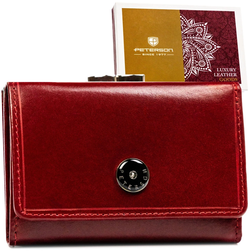 Skórzany portfel damski w czerwonym kolorze zamykany zatrzaskiem i biglem - Peterson