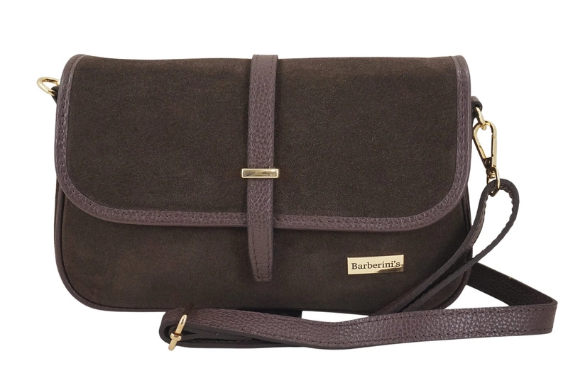 Zamszowa torebka damska Barberini's w kolorze ciemnego brązu została wykonana ze skóry naturalnej. W ofercie naszego sklepu znajdziesz wiele modeli funkcjonalnych torebek listonoszek, na długim regulowanym pasku, w szerokiej palecie kolorów, z delikatnymi złotymi lub srebrnymi ozdobami. Wszystkie harmonijnie dopełnią kobiecy look, stanowiąc jego praktyczny dodatek. Klasyczny fason torebki wyróżniający się łączeniem dwóch rodzajów skóry naturalnej oraz złote okucia wyróżniają ten model listonoszki, która podkreśli codzienne swobodne stylizacje do pracy, na zakupy, spacer lub krótki wyjazd. Dostępna w najnowszej kolekcji, w szerokiej palecie kolorów, zamszowa torebka damska Barberini's będzie idealna dla osób, którym zależy na stylowych i jednocześnie funkcjonalnych torebkach ze skóry naturalnej. Dzięki klasycznemu i stonowanemu wzornictwu dopasujesz torebkę zarówno do casualowych sukienek lub spodni dżinsowych. Zapoznaj się z najnowszą ofertą torebek skórzanych dostępnych w naszym sklepie - listonoszek, klasycznych lub wygodnych plecaków oraz portfeli. Oferujemy duży wybór produktów galanterii skórzanej Dla Niej i Dla Niego.