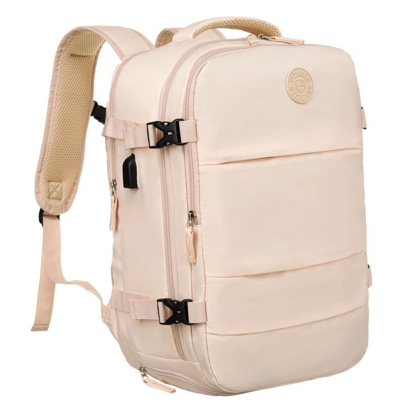 - Wielofunkcyjny plecak podróżny z poliestru w beżowym kolorze. Sprawdzi się idealnie zarówno dla osób aktywnych, jak i tych, którzy potrzebują funkcjonalnego, a zarazem modnego akcesorium na co dzień. Wyposażony w 3 komory i aż 9 kieszeni.