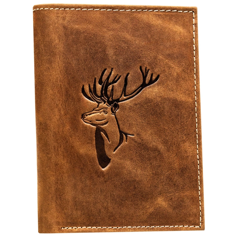 Ten wyjątkowy portfel wykonany został z naturalnej skóry o stylowym, lekko przecieranym wykończeniu. zdobiony eleganckim tłoczeniem przedstawiającym jelenia.