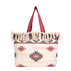 Duża, materiałowa torba typu worek w azteckie wzory, wykończona frędzelkami.