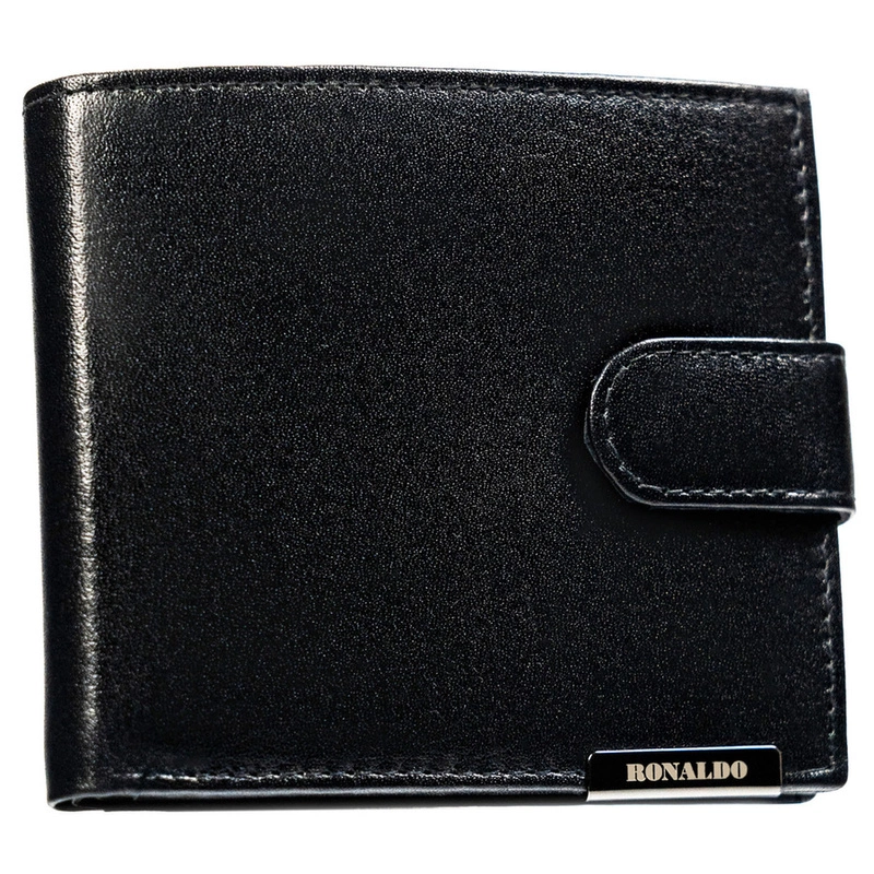 Czarny, poziomy, pojemny portfel męski ze skóry naturalnej zamykany zatrzaskiem - Ronaldo
