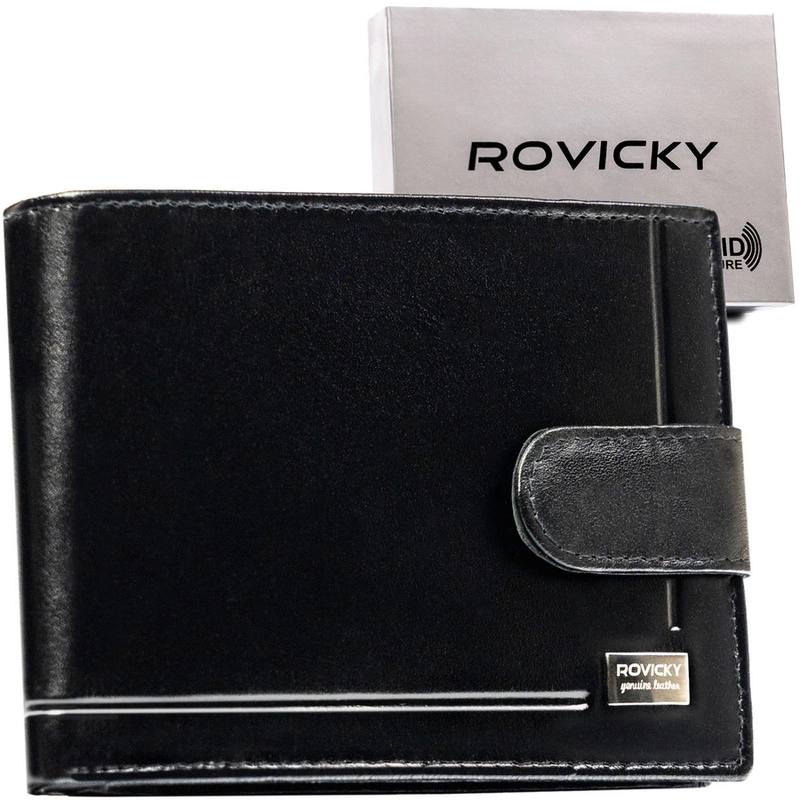 - Stylowy portfel Rovicky to świetny wybór dla mężczyzny, który lubi klasyczne dodatki w nowoczesnym wydaniu. Wykonany z wysokiej jakości skóry naturalnej, w poziomej orientacji i średnim rozmiarze, idealnie mieści się w kieszeni spodni lub marynarki.