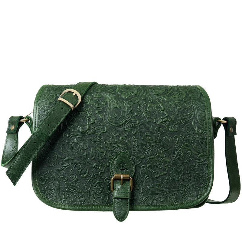 - Naturalna skóra vintage z klapką z tłoczeniem, która wyróżnia torebkę na tle innych dodatków;