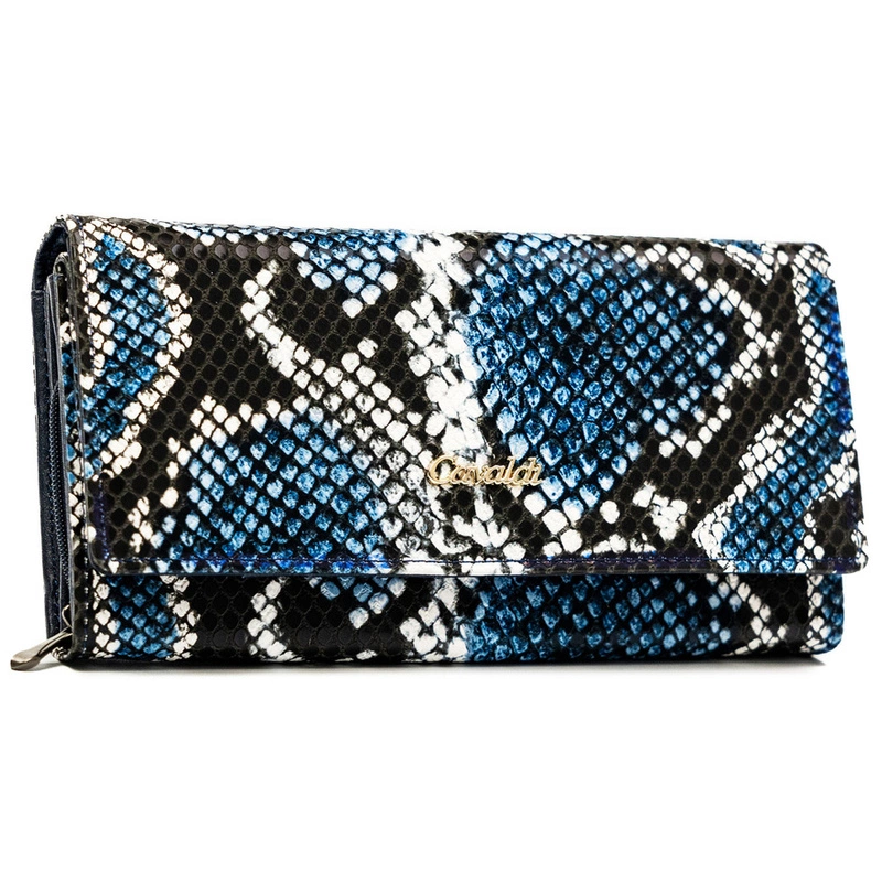 - Duży, poziomy portfel damski Cavaldi został wykonany ze skóry naturalnej z fakturą skóry węża, co nadaje mu luksusowy i nowoczesny wygląd. Złote okucia oraz praktyczny zatrzask podkreślają elegancję modelu, a subtelne logo producenta dodaje prestiżu.