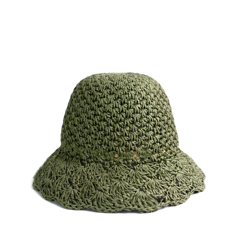 Letni, pleciony kapelusz typu bucket wykonany z trawy.