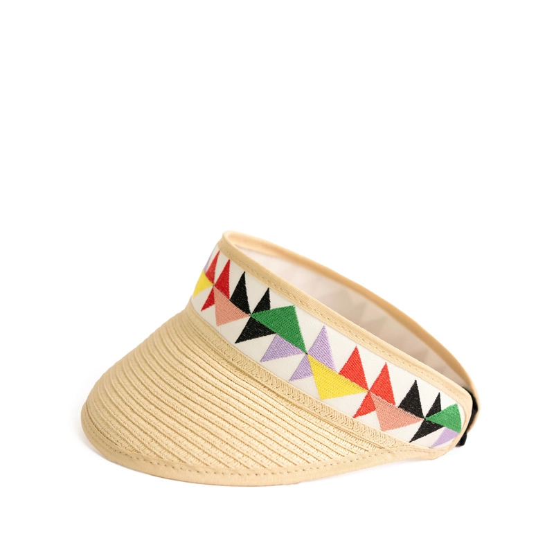 Damski daszek na lato z ozdobną, kolorową tasiemką w geometryczne wzory.
