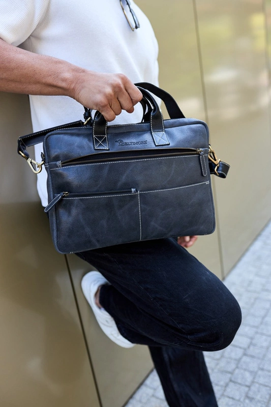 Ekskluzywna, wysokiej jakości, męska torba serii vintage na laptopa na ramię marki Beltimore® wykonana z najwyższej jakości skóry naturalnej typu nubuk, w eleganckim, czarnym, postarzanym kolorze.