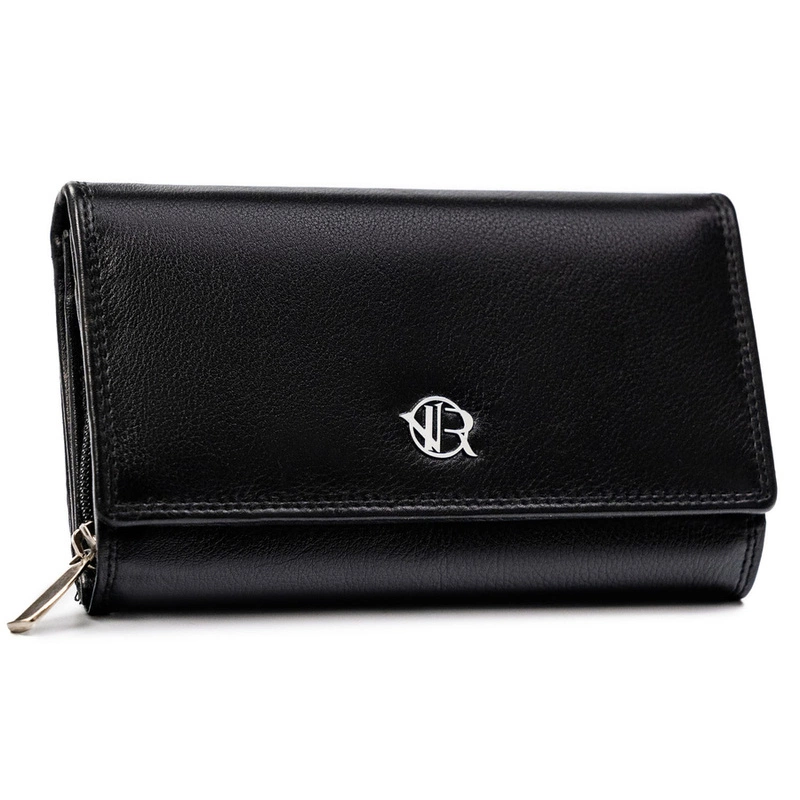 - Czarny portfel damski z naturalnej skóry. Pojemny i funkcjonalny, wyposażony w ochronę RFID, idealny na karty, dokumenty i banknoty. Model mieści dowód rejestracyjny. Wyposażony w wewnętrzną kieszonkę zamykaną na suwak.