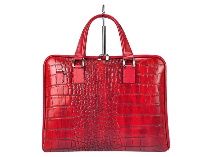 - Duża damska aktówka, torba na dokumenty, laptopa od Vera Pelle. Piękny wzór w typie skóry krokodyla, wyróżnia ten model na tle innych. Wyposażona w trzy kieszenie oraz organizer; dwie komory. W zestawie dopinany, regulowany pasek.